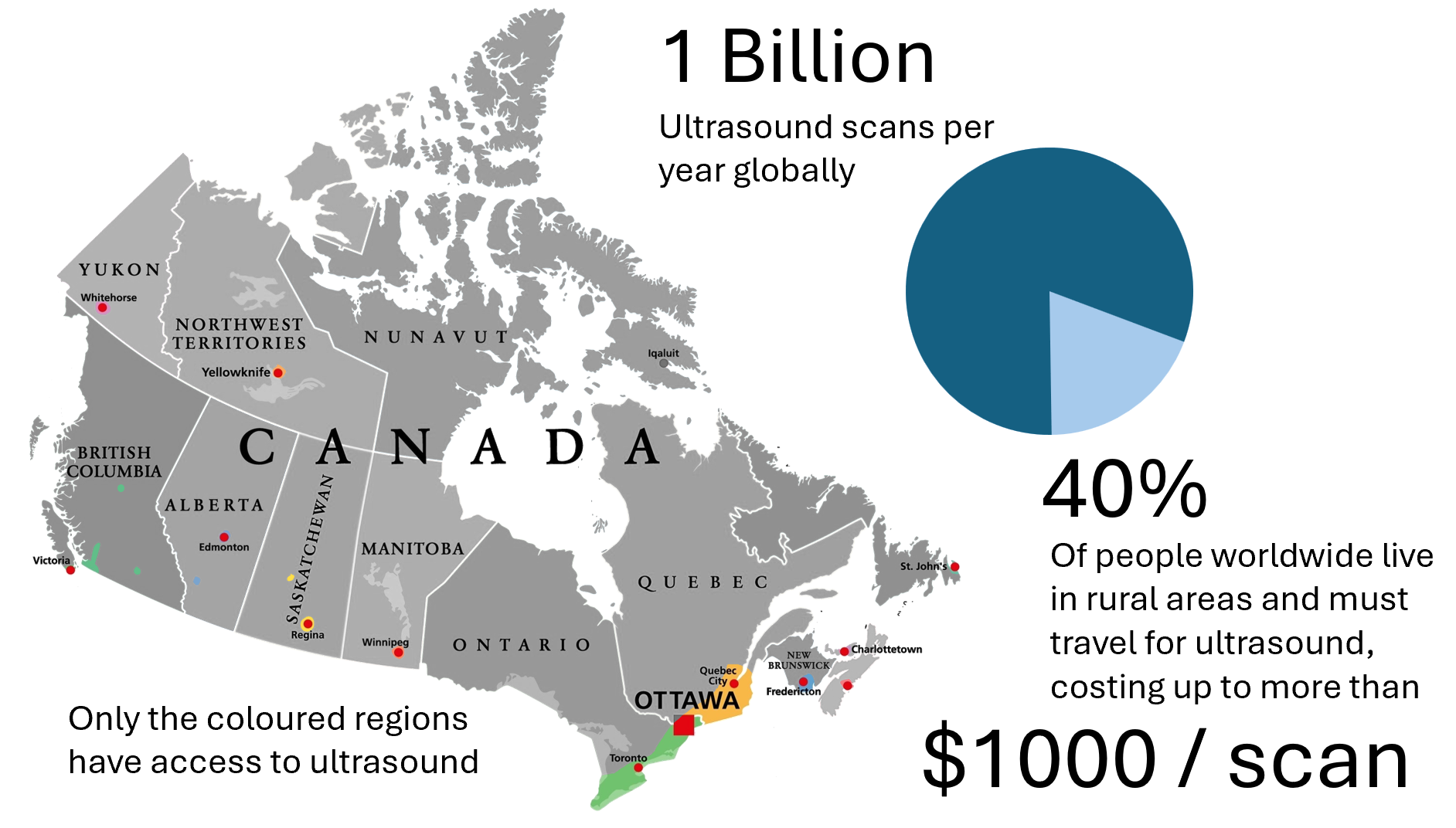 Diagnostic ultrasound is used in every branch of medicine, yet rural communities have little to no access. This impacts about 1 in 5 people globally. The only practical solution used today is for patients to travel for scans. This means time away from work and family, facing the risks of travel and the environmental impact, and it costs healthcare systems billions of dollars per year. The tele-ultrasound market is estimated to be worth $100 billion (USD), but current solutions do not solve the problem. Video guidance is too ineffective and imprecise while robotics is too complex, expensive, and inflexible.
